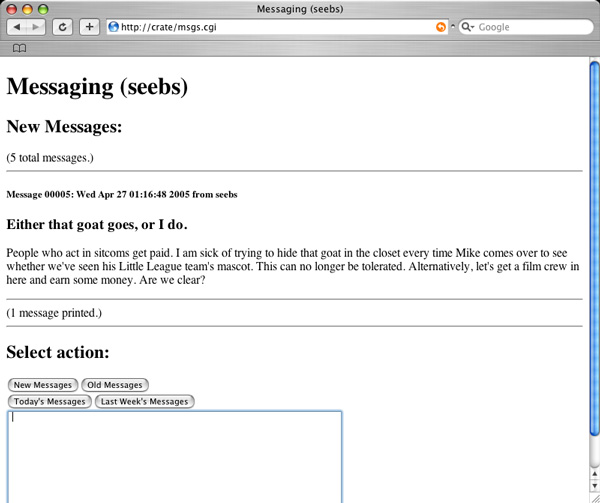 /var/www/msgs 是一个新目录,用于保存消息(以数字命名的文件)和用户记录(使用 .htaccess 文件中给出的用户名作为文件名)。CGI 脚本会识别自身,执行被请求的动作,并展现出相当简单的界面;它所需要的只是一些按钮和一个文本区域。 为了表示尊敬,这个脚本命名为 msgs.cgi.